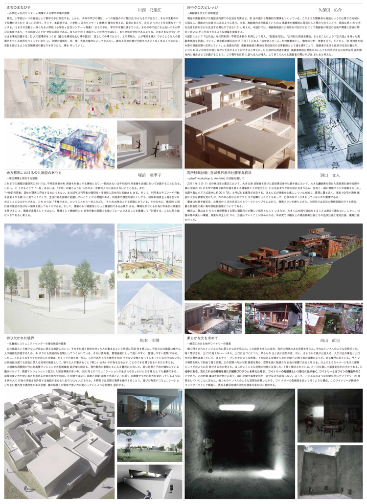 1985年宮城県生まれ。2012年法政大学大学院工学研究科建設工学専攻修了。設計事務所に勤務後、2013年10月より仙台市に入庁し、仙台市都市整備局 都市再開発課に配属。入庁後、スクラップアンドビルドに頼らずに、公民問わず利活用されていない空間を利活用するまちづくりを提案。その後、プロジェクト化し、現在は公民連携型の新しいまちづくり「せんだいリノベーションまちづくり」を行政職員という立場から企画・推進している。また、公民連携型のまちづくりを進めるためには、これからの行政職員は民間をワクワクさせなけれいけないという想いから『せんだい洛中洛外図』を製作。建築設計事務所とは違った立場から建築や都市を考え、市役所職員という立場から、建築家とは違ったアプローチでまちづくりを提案しています。建築学科→設計事務所という枠に囚われることなく、建築学科で培ったスキルを活かすことが出来るという点で、進路に悩む学生や、建築家としてではなく、建物やまちづくりに関わりたいと思っている学生にとってはとても参考になるお話が聞けると思います。下記URLから洞口さんが関わっている活動の詳細も見れます。